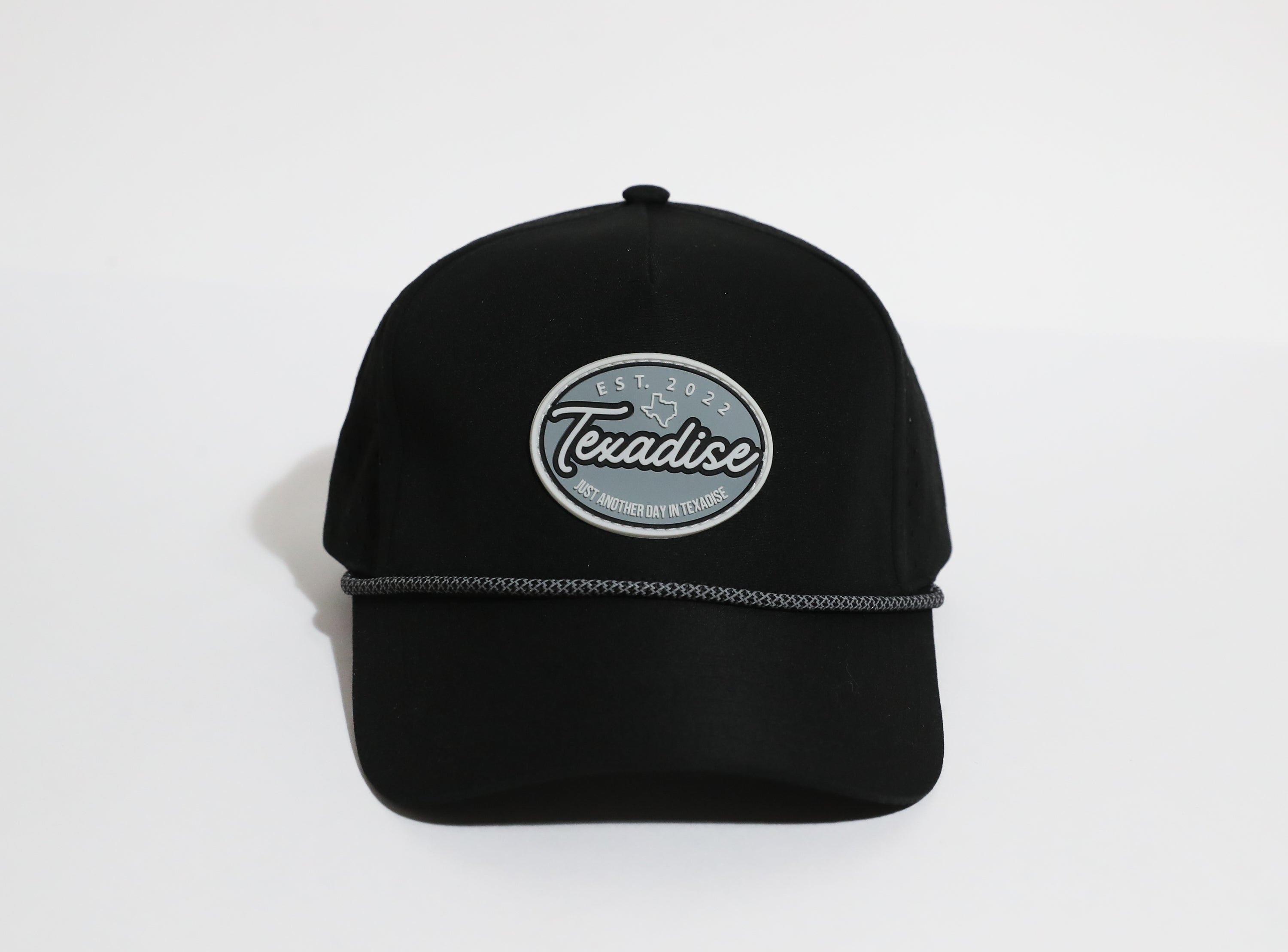 Just another day in Texadise! Navy performance hat with a navy and white rope. Gray PVC patch sewn on in the middle. Snapback. Black performance hat...