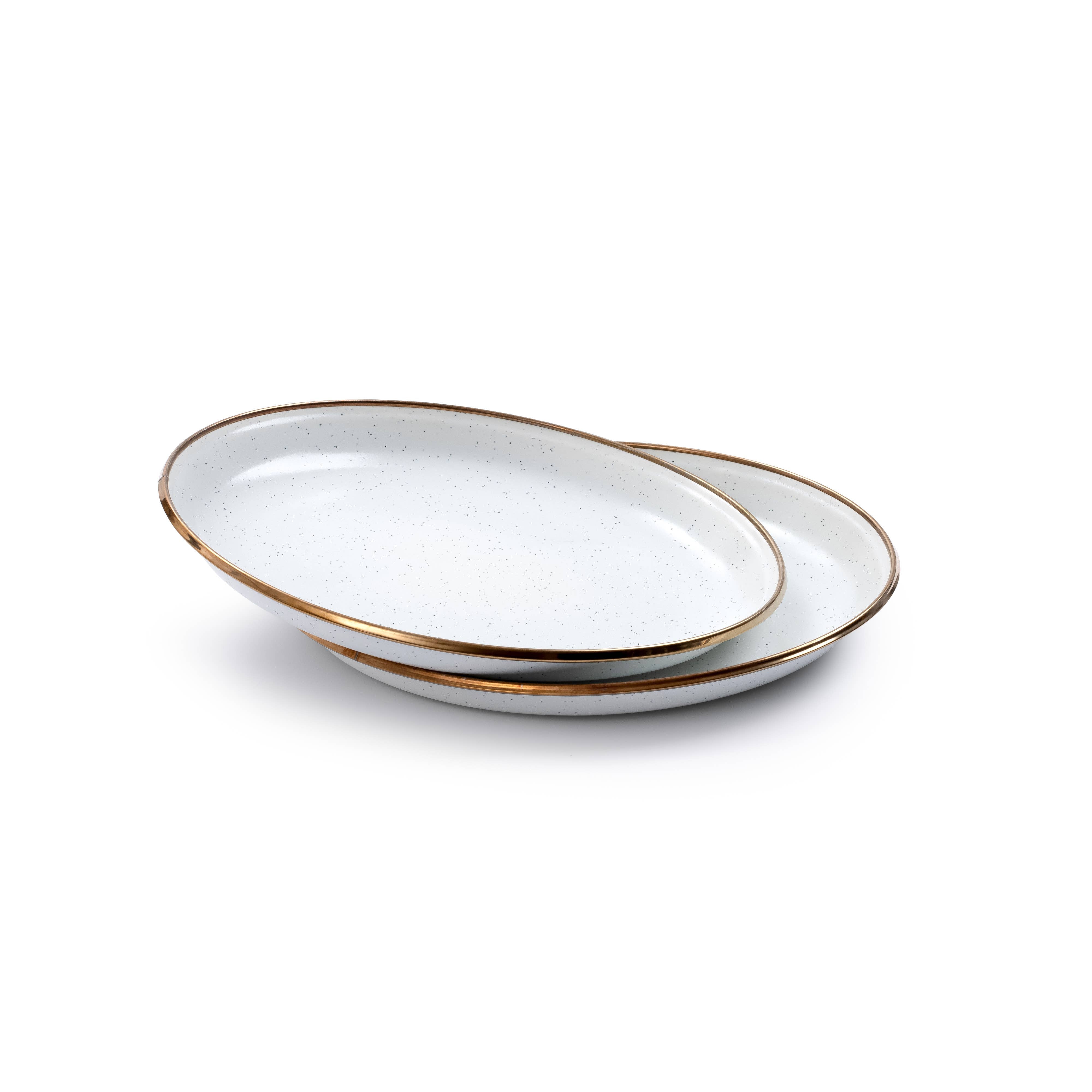 Each item features a hand-finished baked stainless steel trim creating a bronze-like patina finish, resulting in unique pieces that form a cohesive set. Barebones' Enamelware rim...
