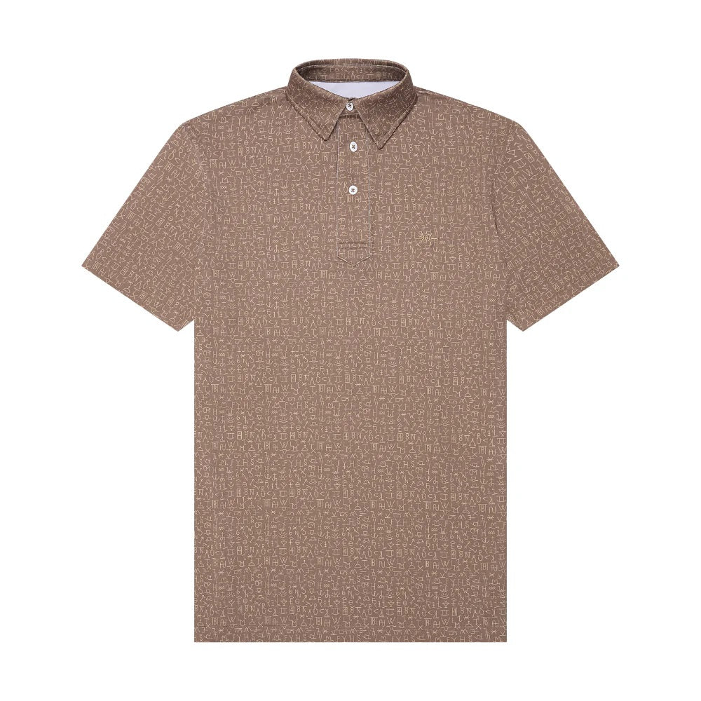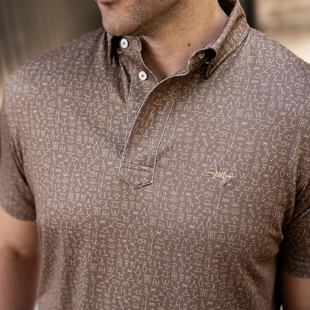 The Chisholm Traditions Polo draws from a tradition older than Texas itself. Its pattern nods to the historic brands burned into ranch gates and cattle hides—marks of ownership, pride, and legacy. The design honors the hard-earned symbols of Texas ranch life with a refined take you can wear anywhere.