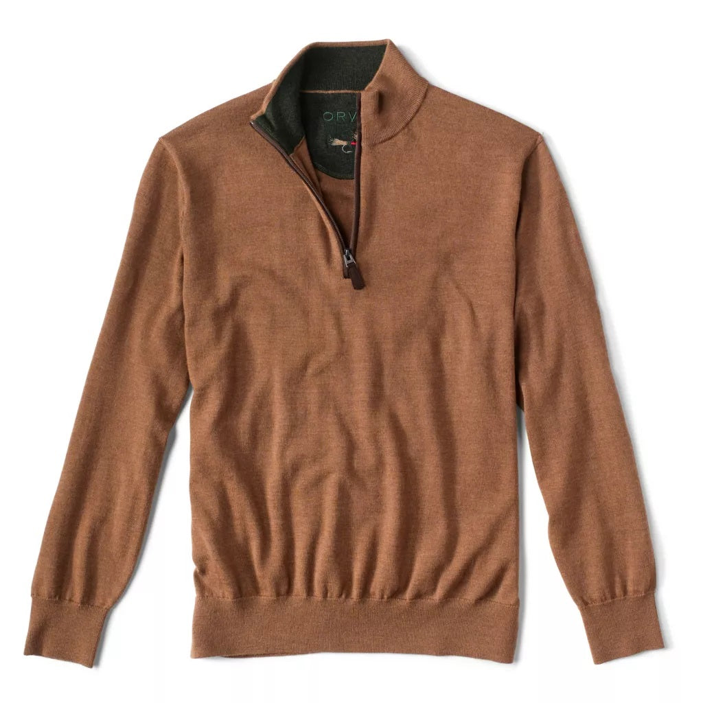 This customer-favorite pure merino wool quarter-zip sweater has been given an eco-friendly update that uses a new and improved yarn. The new wool comes from farms located in unpolluted areas, where ethical farming practices are applied to fully respect both the animals and the territory. Softer, loftier, and less prone to pilling, our quarter-zip is also outfitted with eco-suede details at the front zip. Plus, we’ve improved the fit, giving it a more distinctive look. Rib-knit trim at the collar, hem, and cuffs. Contrast half-moon at interior center back with Royal Wulff fly embroidery. Classic fit.